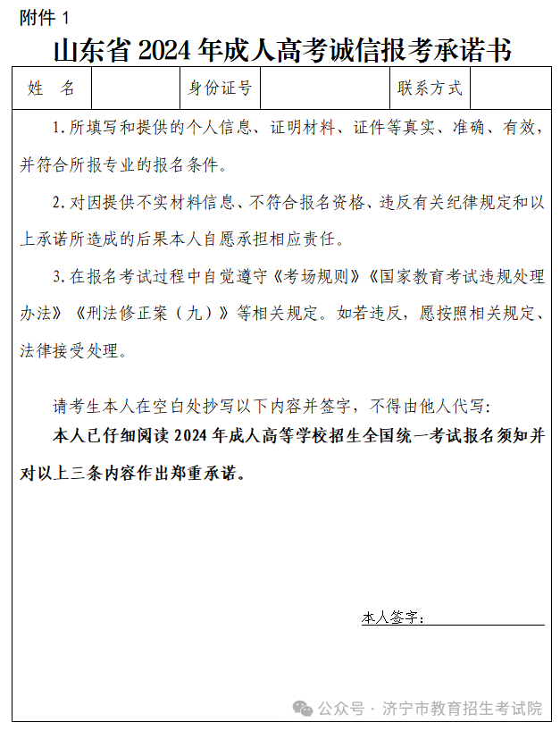 (1)所有考生均须上传山东省2024年成人高考诚信报考承诺书(以下简称诚信报考承诺书,格式见附件1)扫描件。