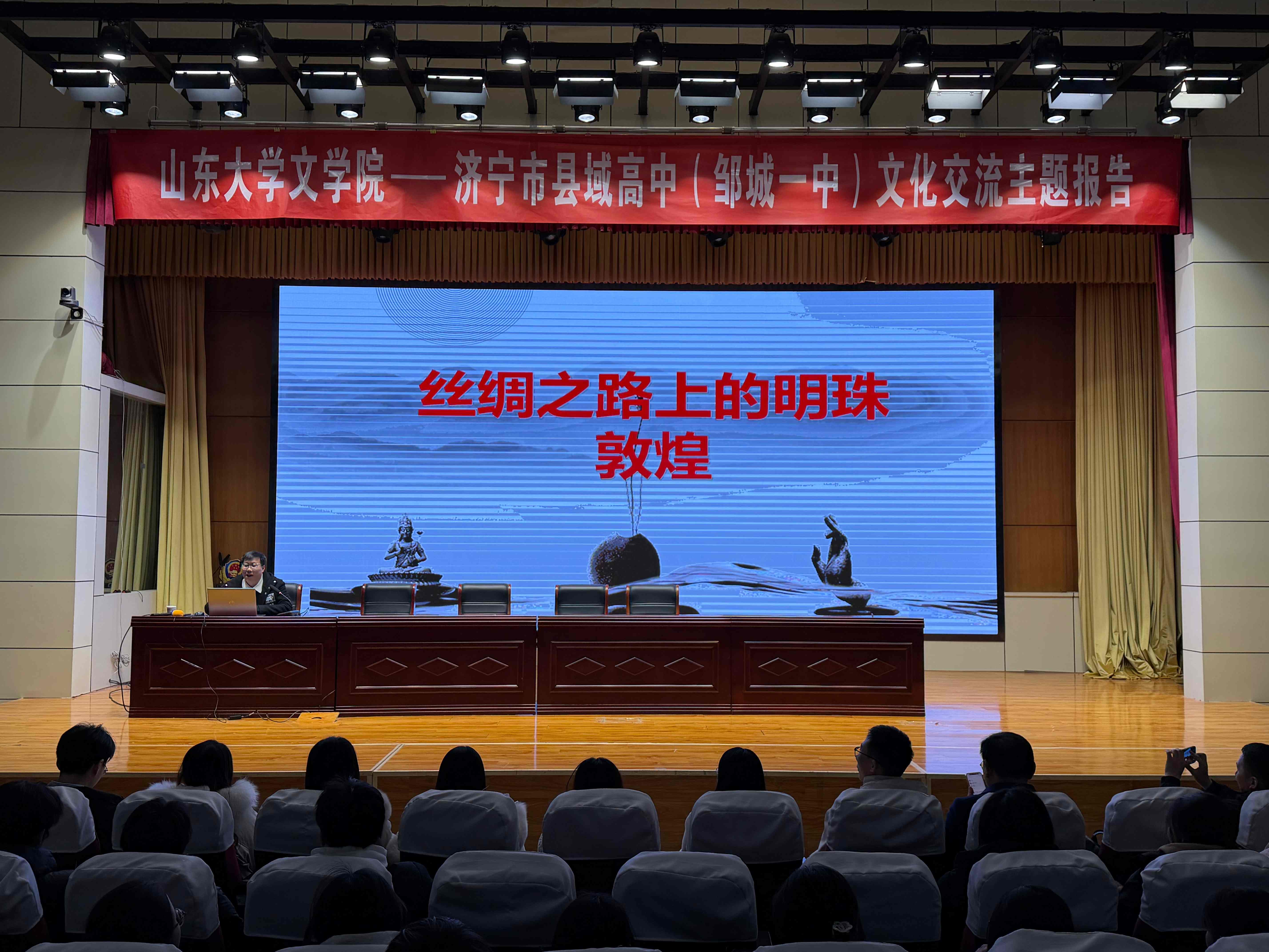 赵鑫副教授作了题为“中国古典诗歌的阅读与欣赏”学术讲座。通过生动讲述山大前辈的故事,诠释了严谨求实的治学精神;通过经典文本分析,阐释了古典诗歌中音韵、炼字、意境等核心要素;同时又从诗史互证的视角揭示了创作与时代、个体的深层关联;最终延伸至现代语境下的创新表达,构建起“传统—当下”的对话空间。张鹏副教授作了题为“丝绸之路上的明珠——敦煌”的讲座。从莫高窟的壁画艺术到藏经洞的文献宝藏,他以敦煌的历史遗迹为线索,带领同学们穿越时空,走近这座千年丝路重镇,揭示了敦煌作为古代文明交汇枢纽的独特价值,展现了不同文明在敦煌的碰撞与融合,让同学们直观感受到敦煌艺术的多元面貌。两