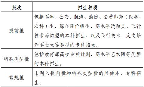 答:普通类分为提前批、特殊类型批和常规批三个录取批次,录取工作按三个批次依次进行。各批次包含的类型为: