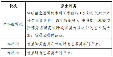 答:艺术类分为本科提前批、本科批和专科批三个录取批次,录取工作按三个批次依次进行。各批次包含的类型为: