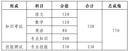 答:春季高考统一考试包括“知识”和“技能”两部分,考试科目和分值如下表:
