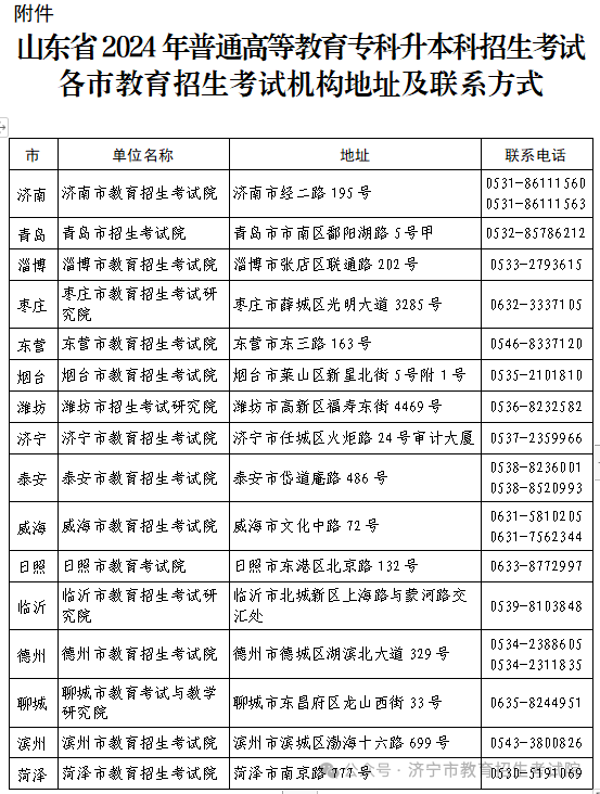 附件:山东省2024年普通高等教育专科升本科招生考试各市教育招生考试机构地址及联系方式