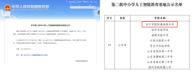 根据《教育部办公厅关于开展第二批中小学人工智能教育基地推荐工作的通知》(教基厅函〔2025〕15号)要求,2025年11 月 10 日,教育部正式公示第二批中小学人工智能教育基地名单,济宁学院附属高级中学凭借在人工智能教育领域的系统布局、创新实践与突出成效成功入选。济宁学院附属高级中学不仅是本次获此殊荣的山东省的九所学校之一,更是济宁市中小学校的唯一。这一成果彰显了学校在基础教育阶段人工智能教育领域的领先地位,标志着学校的 “科技兴校” 战略迈入新阶段,并将为区域人工智能教育发展树立了典型。