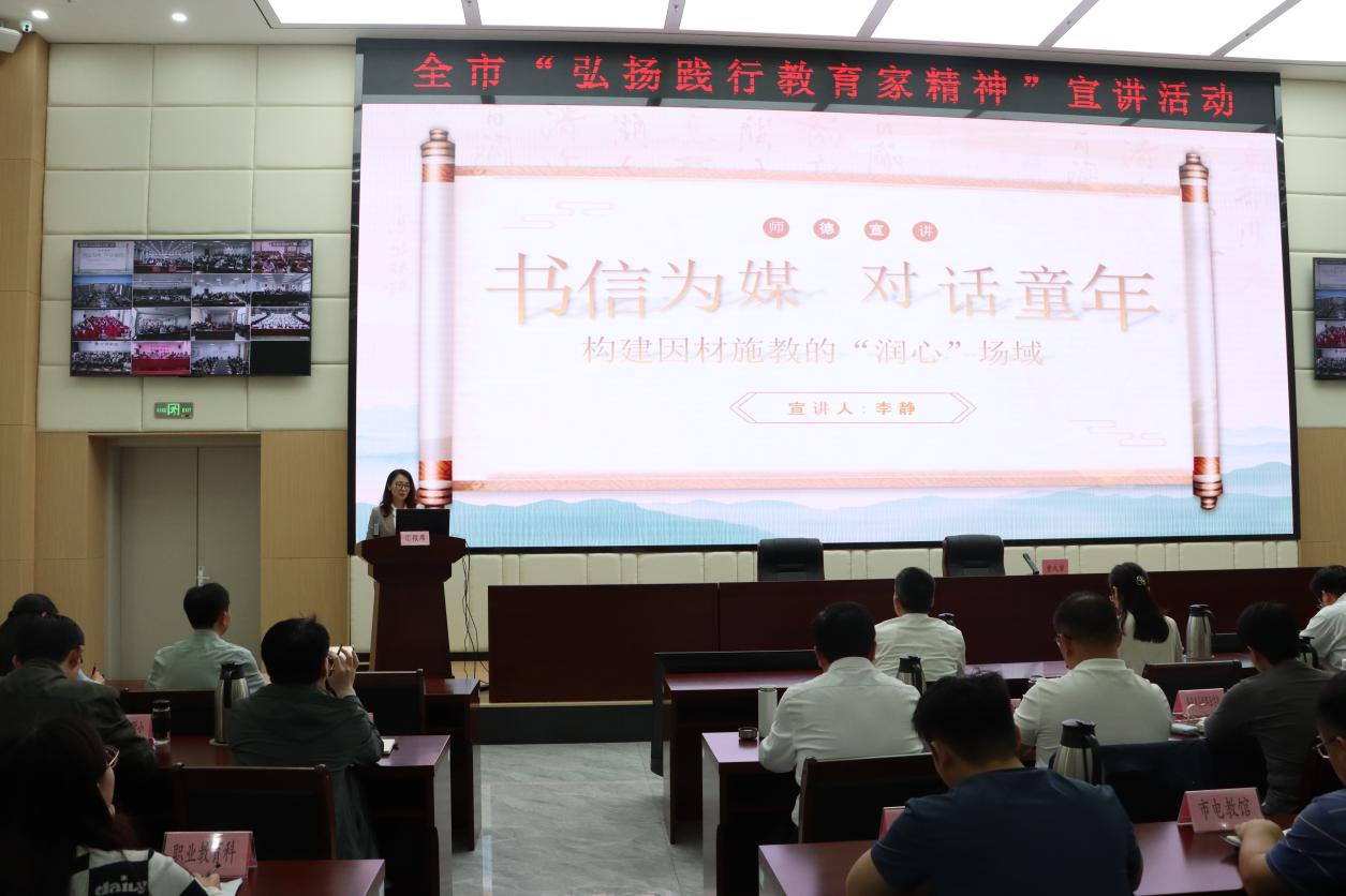 9月29日,全市教育系统弘扬践行教育家精神宣讲活动成功举办,本次宣讲活动以“铸魂强师守初心 立德树人践使命”为主题。这是我市深入学习贯彻习近平总书记关于教育的重要论述、重要指示批示精神的生动实践,也是教育系统弘扬培育“教育家精神”、推动教育强市建设的实际行动。市教育局副局长褚福梅出席并讲话,市教育局党组成员、市纪委监委驻市教育局纪检组组长王敏彦出席活动。