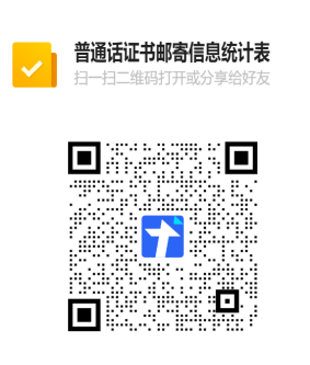2023年9月到2025年9月在济宁教育学院参加测试的考生,请于2026年1月30日前扫描下方二维码准确填写证书邮寄信息统计表,待本中心整理后,采取邮寄到付方式将证书邮寄给考生。(邮寄过程中可能会出现证书丢失情况,按照有关规定,普通话水平测试等级纸质证书遗失的不予补发,请慎重选择)。因选择邮寄方式造成证书丢失的,责任自行承担。