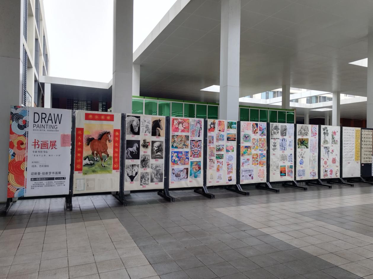 经过学校专业教师团队的细心评审,192件佳作脱颖而出。展台上,楷书端端正正,隶书古朴雅致,国画勾勒出山水诗意;另一边,创意插画色彩明快,现代绘画充满奇思,传统与创新在这里悄悄相遇、温柔碰撞。有的同学临摹经典书法,一笔一画都透着对古人笔墨的敬畏;有的同学画校园的晨光、同学的笑脸,定格青春里的美好瞬间;还有的同学把传统纹样和现代设计结合,让传统文化焕发新活力。这些作品或许技法尚显青涩,却满是少年意气,既藏着对传统的传承,也写着对梦想的诠释。
