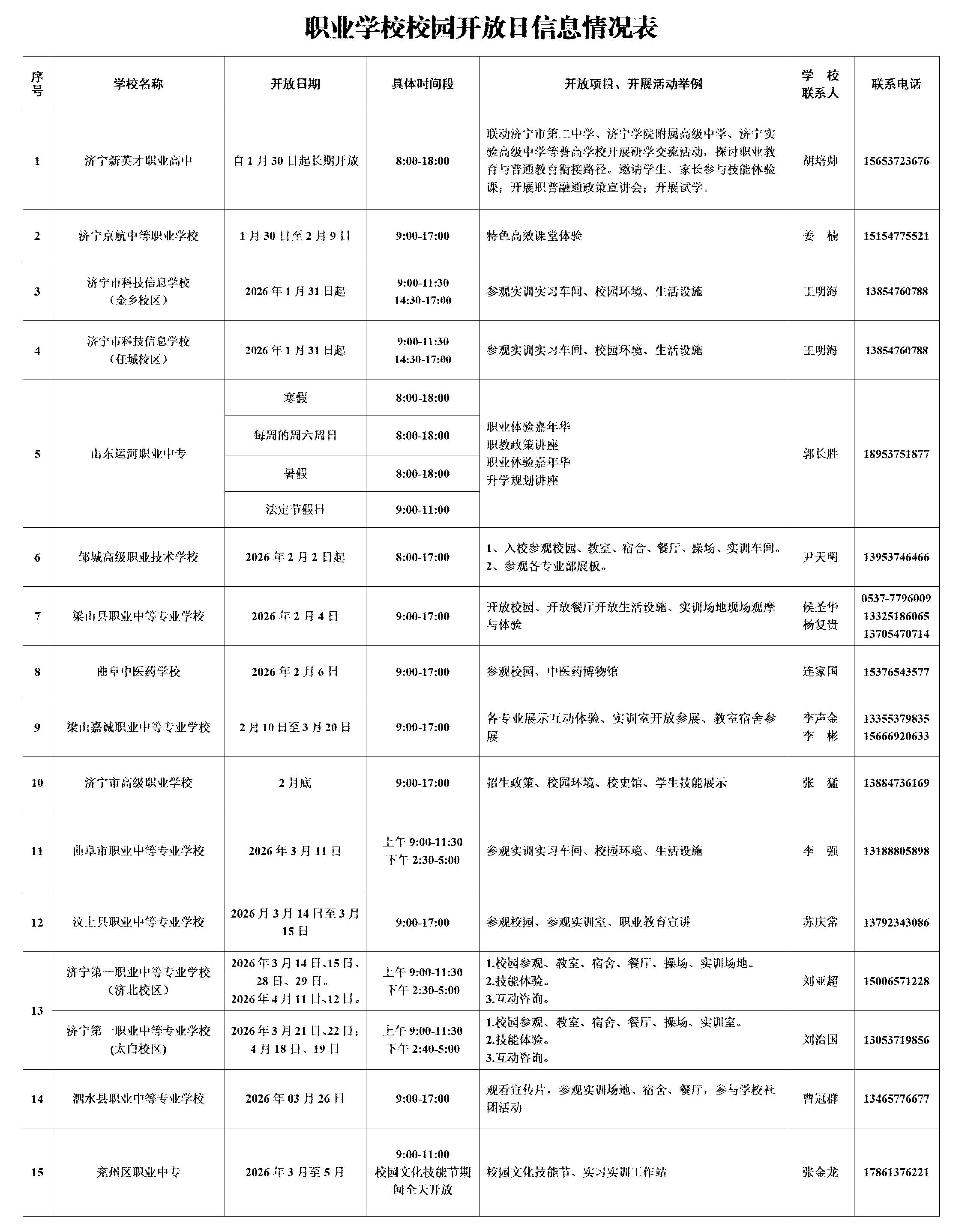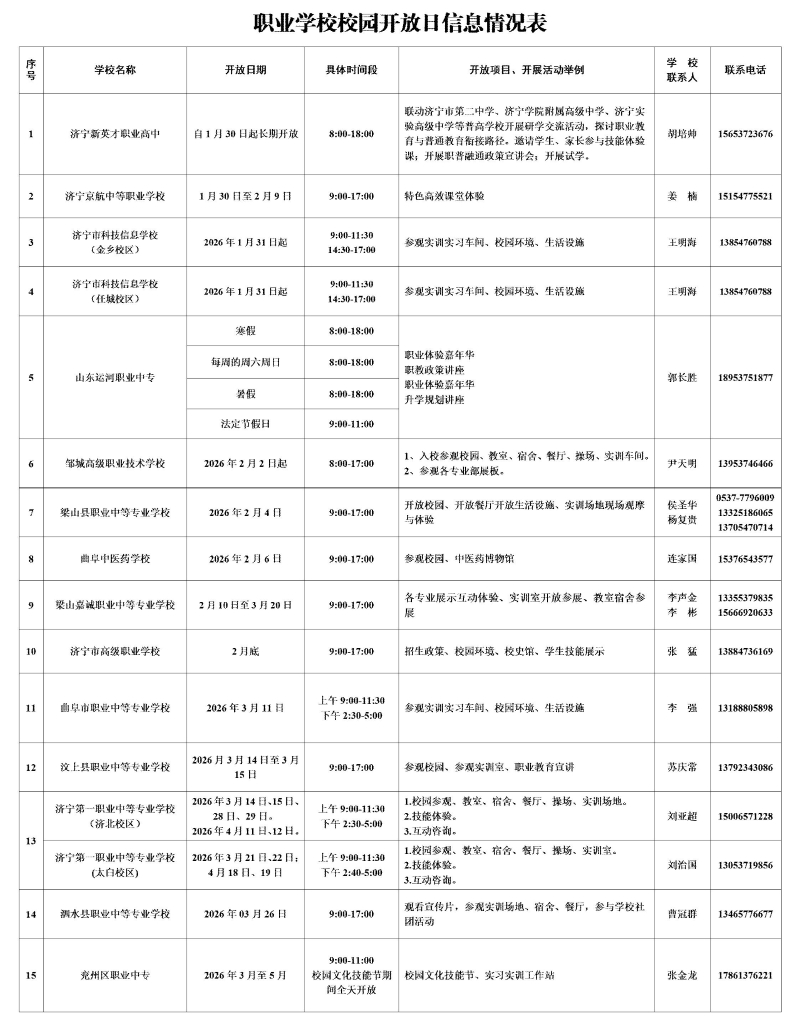 为增进社会各界对职业教育的了解,展现我市职业学校办学特色与育人成果,搭建家校沟通与体验平台,济宁市教育局诚邀您和孩子参加“职业学校校园开放日”活动。