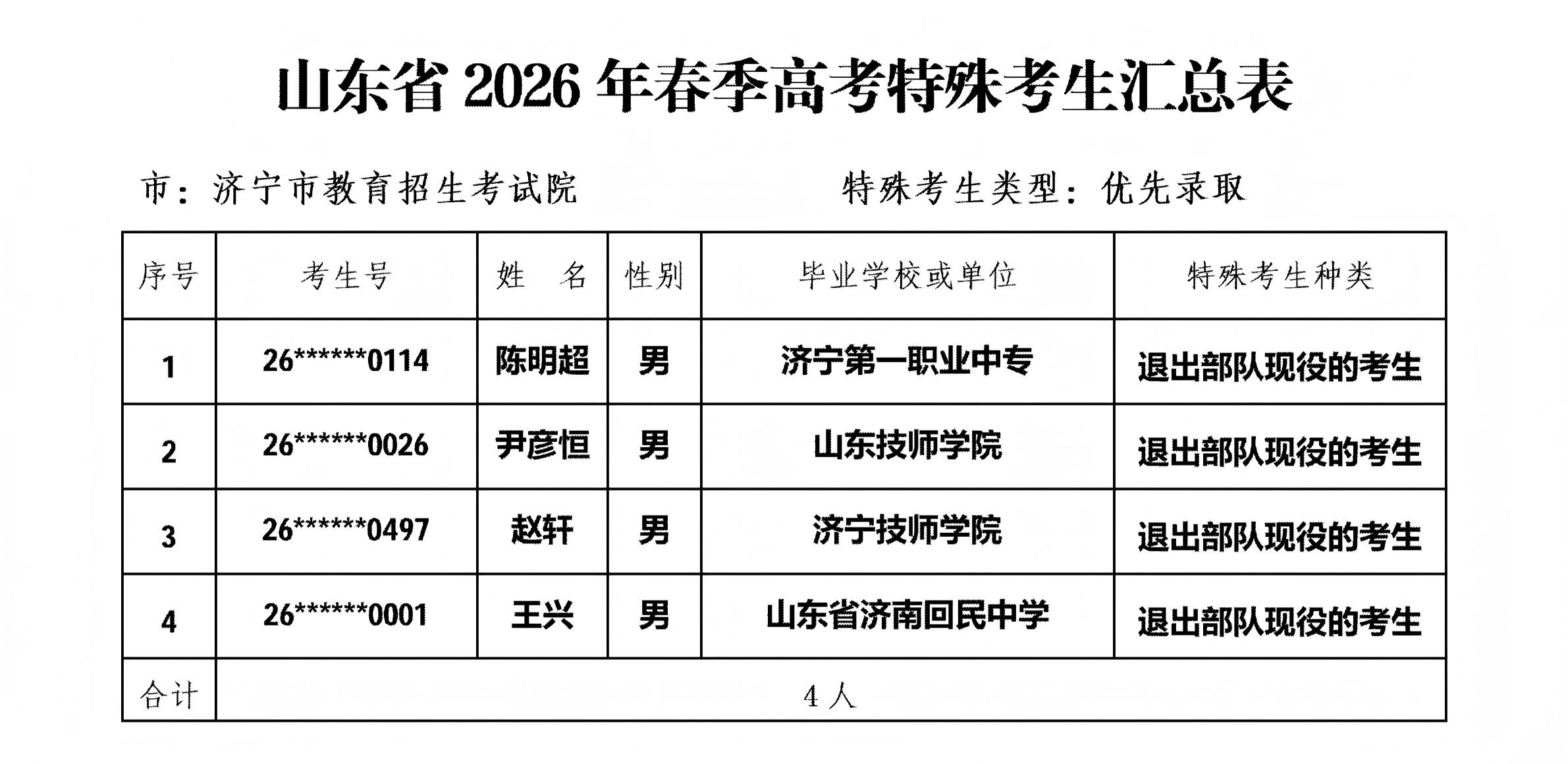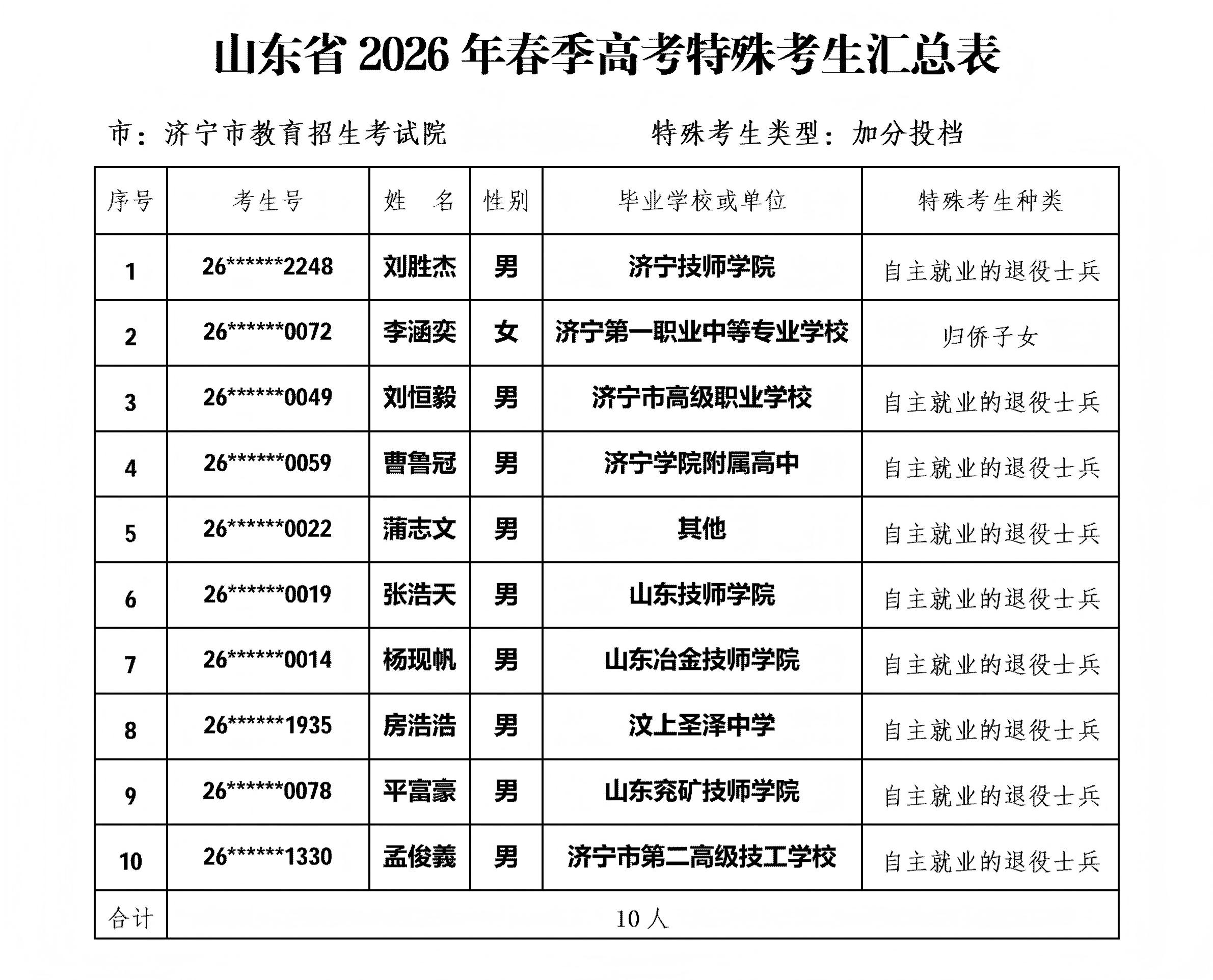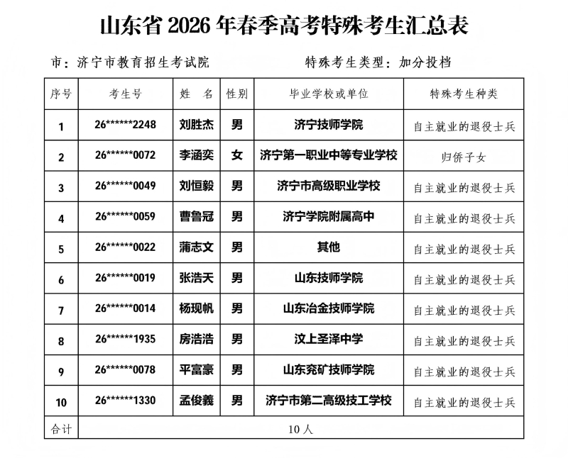 按照山东省教育招生考试院《关于做好山东省2026年普通高等学校招生考试报名工作的通知》(鲁招考〔2025〕105号)文件要求,济宁市教育招生考试院对县市区上报的符合高考录取照顾条件考生进行了严格审核,考生所在高中学校和县市区已分别进行了一级公示和二级公示,现将符合2026春季高考加分投档10人、优先录取考生4人进行三级公示。公示时间为:2026年3月27日至4月9日,为期10个工作日。